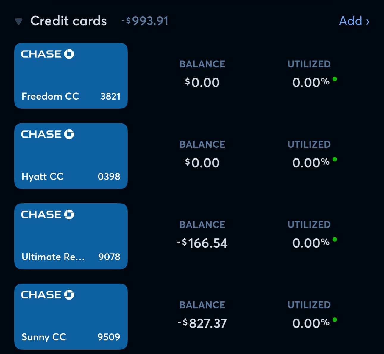 Case in point - here's all 4 of our personal credit cards (we really only use 2). We are carrying a negative balance of $1,000. Don't ask me how that happens.